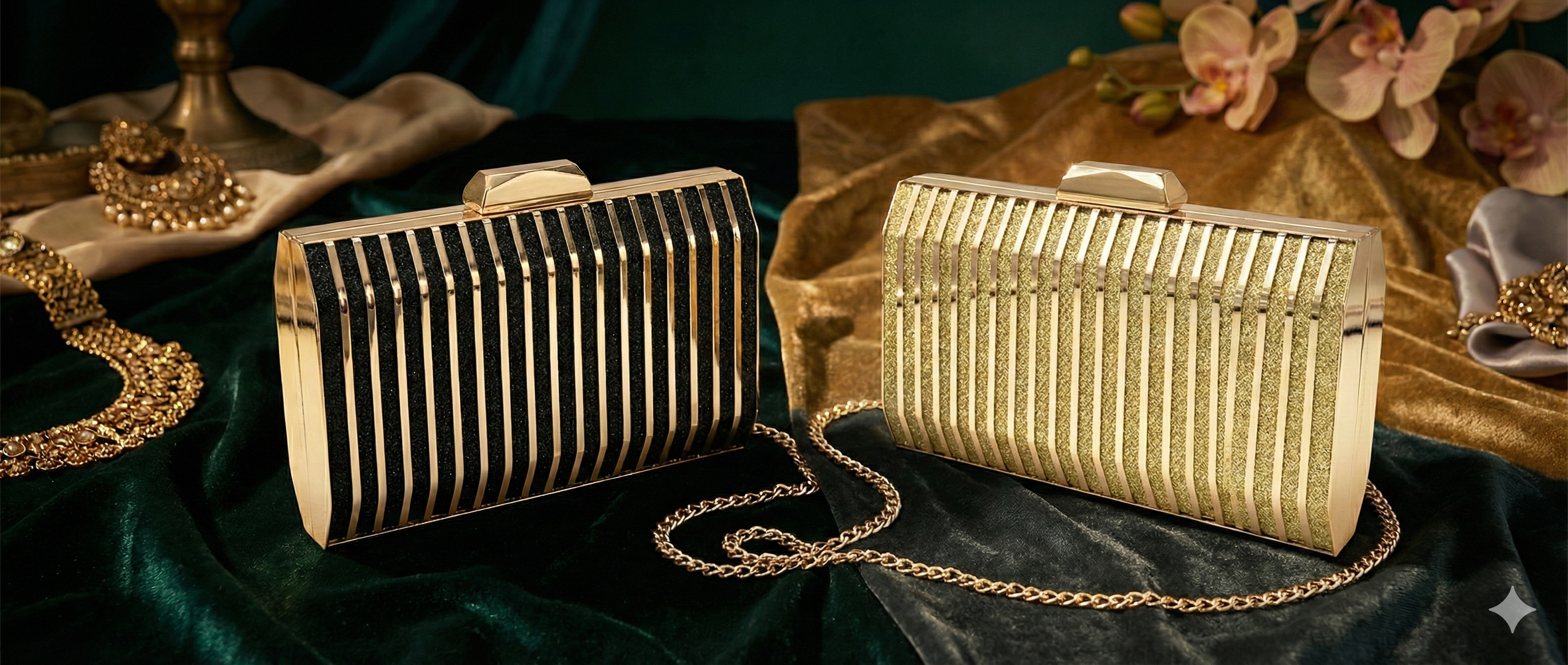 Art Deco Glitter Striped Evening Clutch with Detachable Gold Chain - Gold