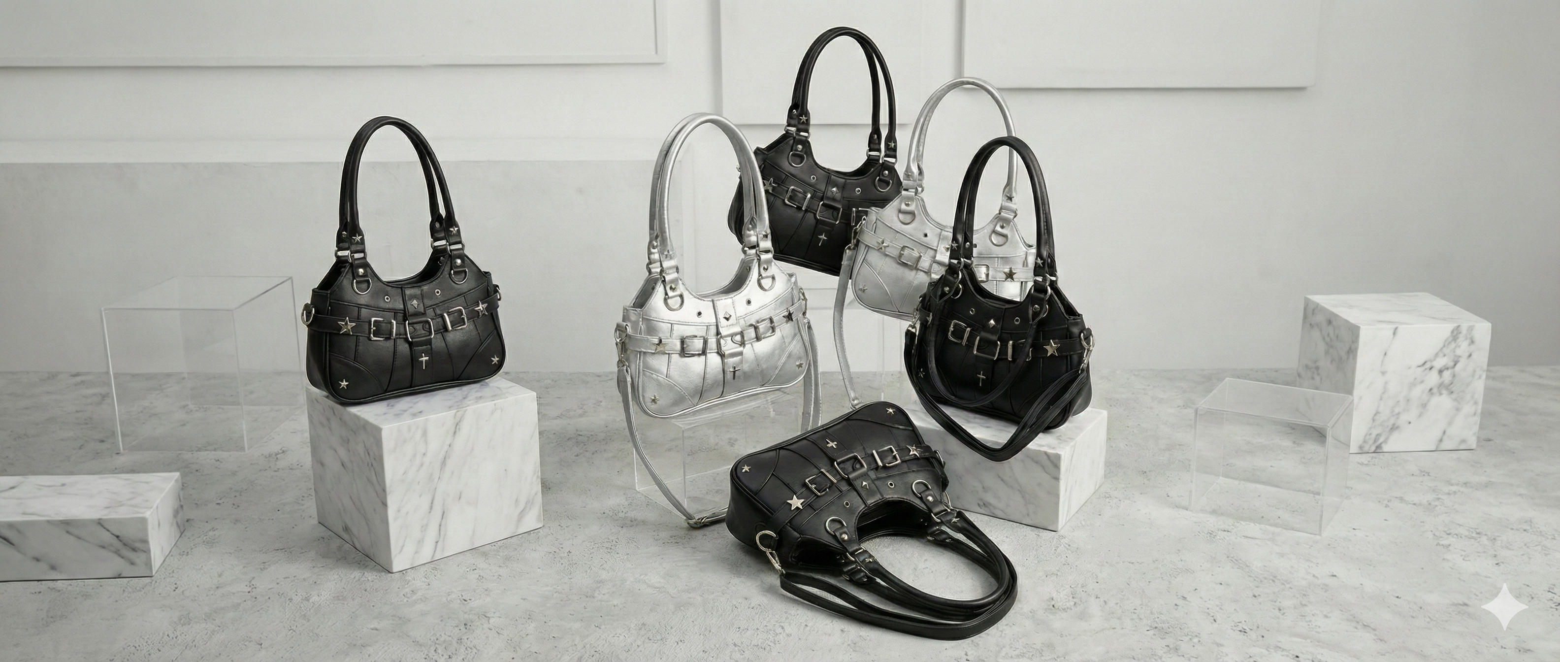 Y2K Studded Buckle Moto Shoulder Bag - Black Grunge Purse - Black