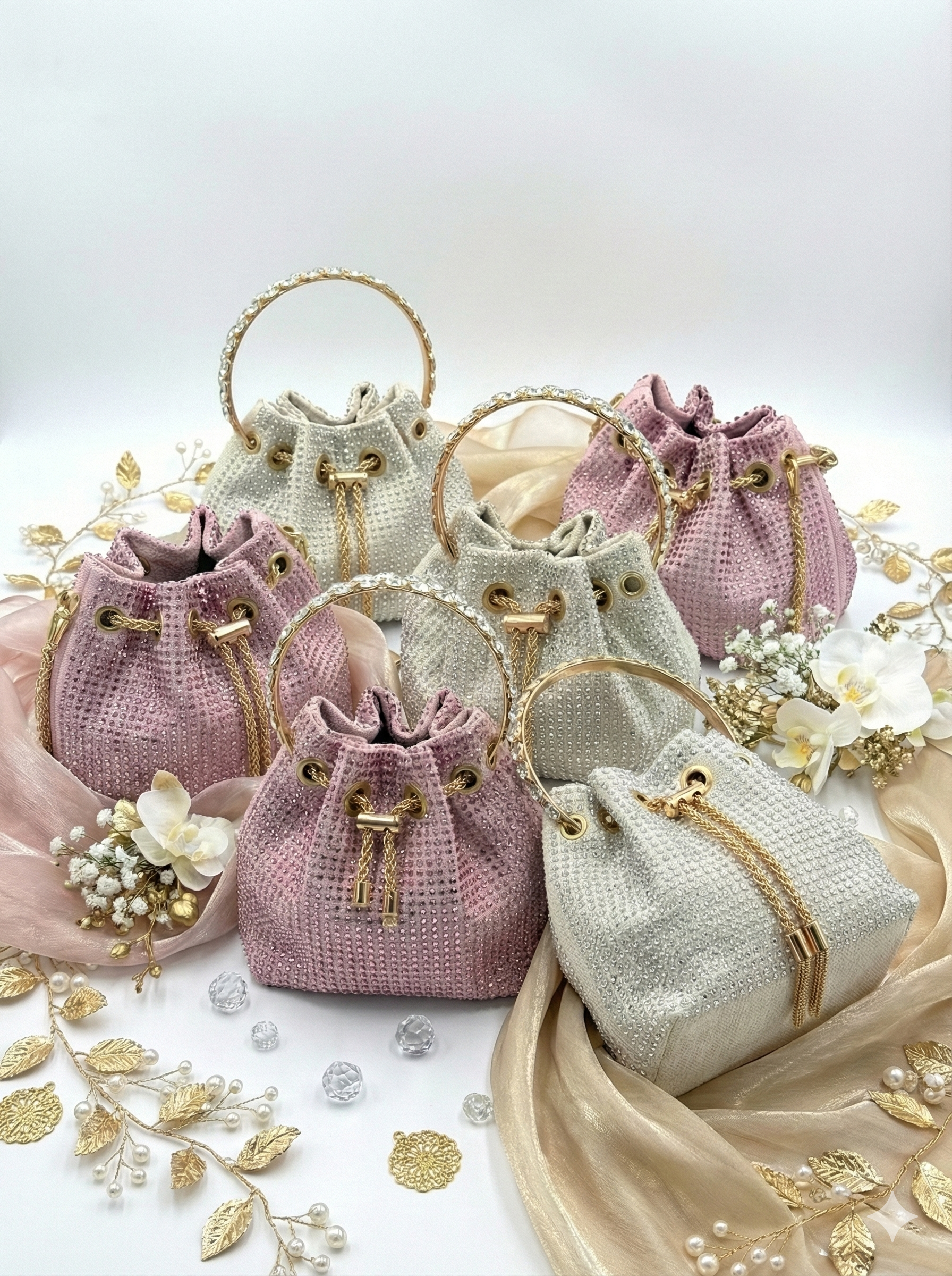 Rough Suede Rhinestone Bucket Bag with Embellished Ring Handle - Mauve