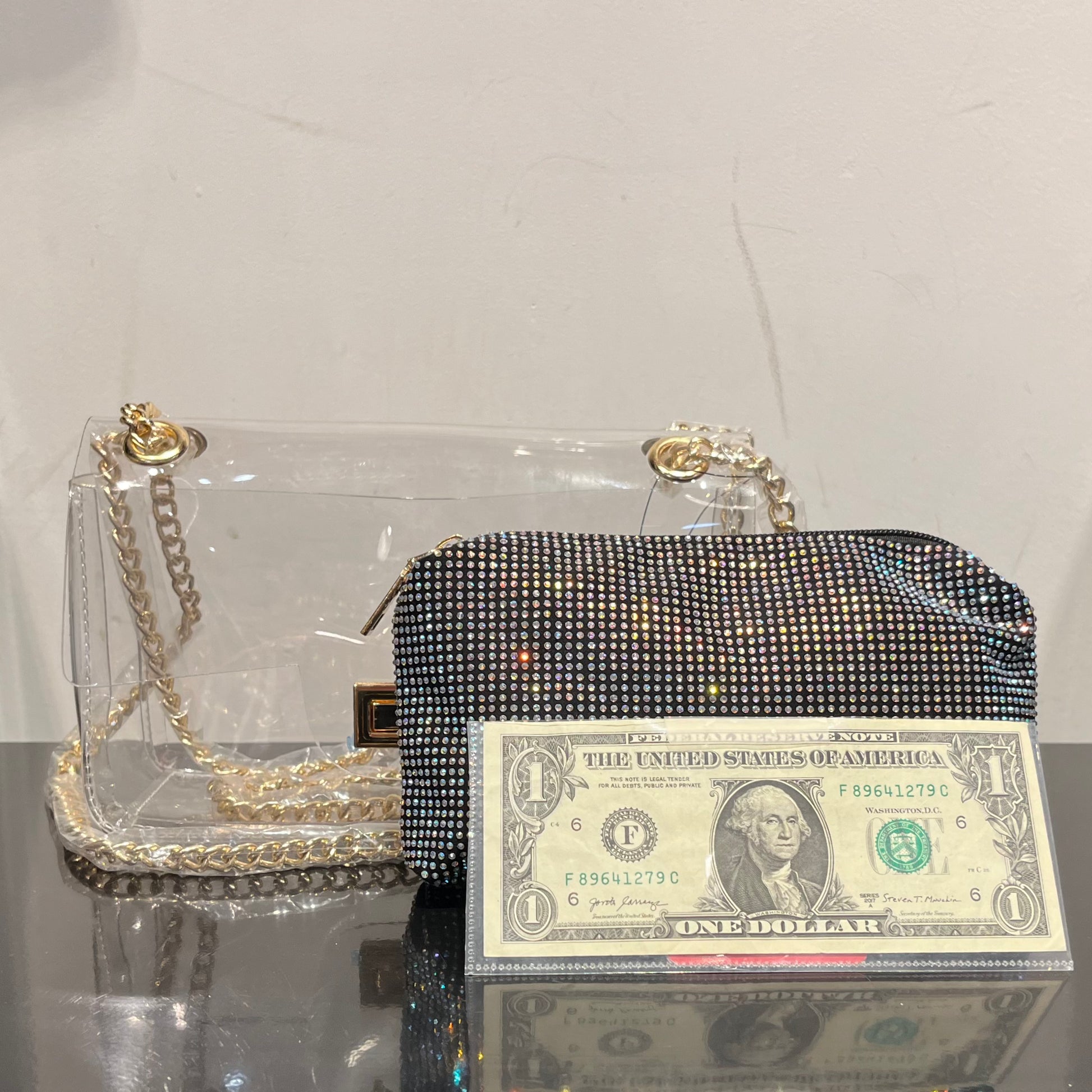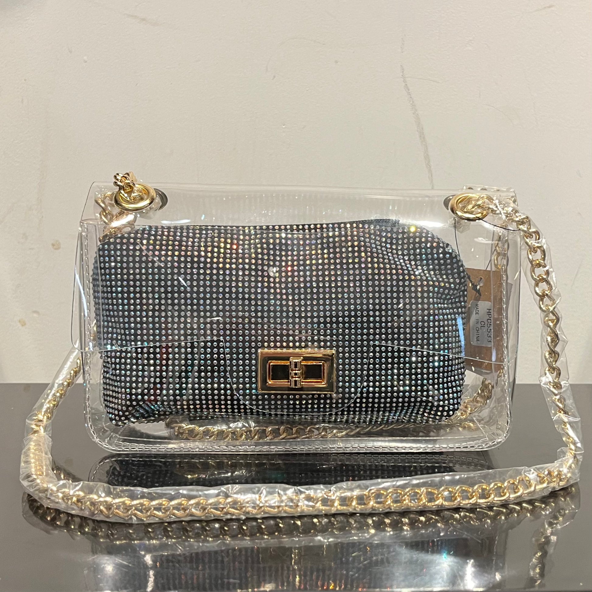 "Stay organized in style with our Transparent Bag w/ Hotfix Pouch! No more digging through your bag for essentials, this bag's see-through design and convenient hotfix pouch make it easy to find what you need. Perfect for concerts, festivals, and more. It's a clear winner! (Get it?)"